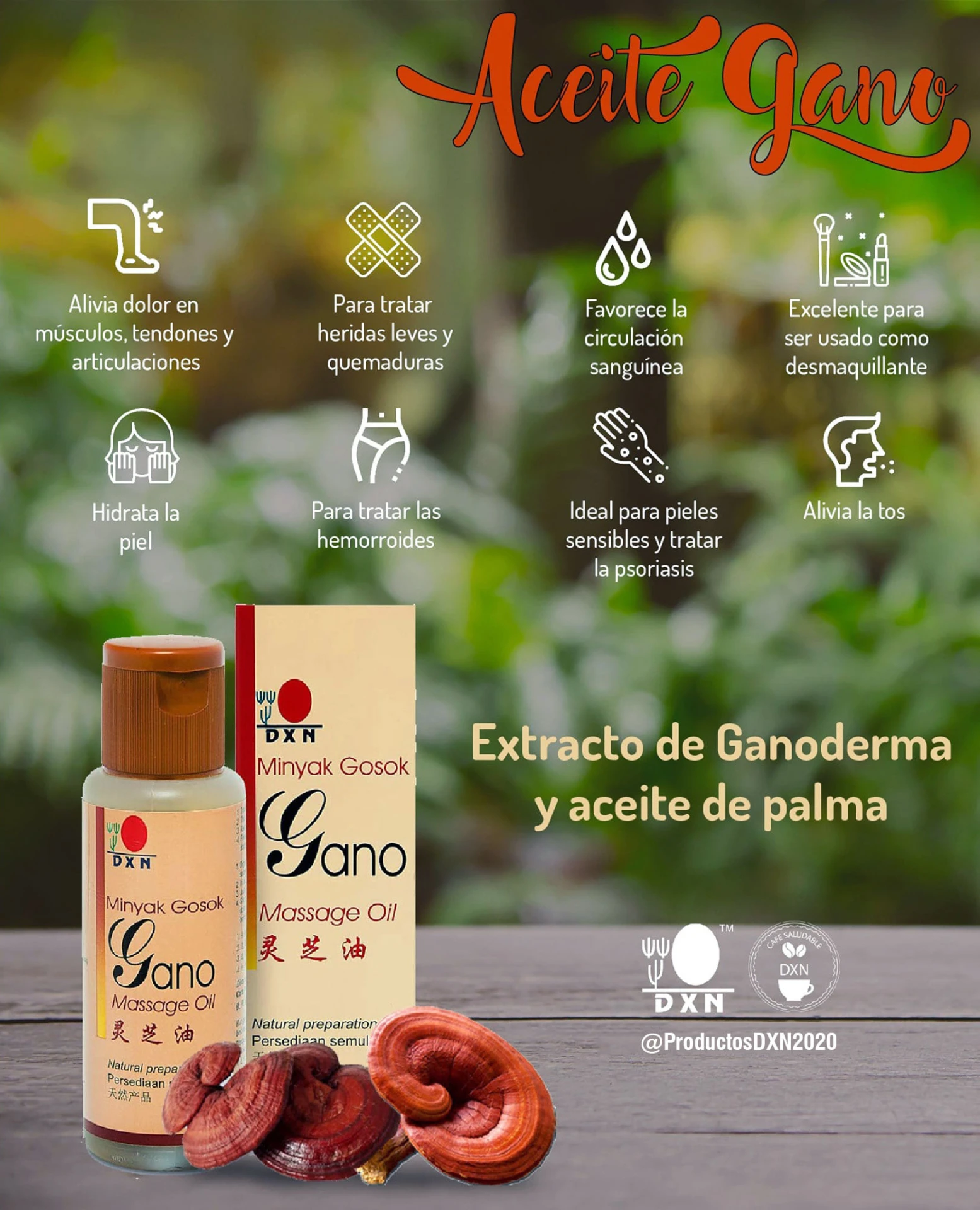 El Aceite de Masaje Gano DXN está enriquecido con extracto puro de Ganoderma y aceite de palma.  Contiene el aceite de palma fina y extracto de Ganoderma adecuados para cada necesidad de masaje. Es totalmente natural y rico en antioxidantes.